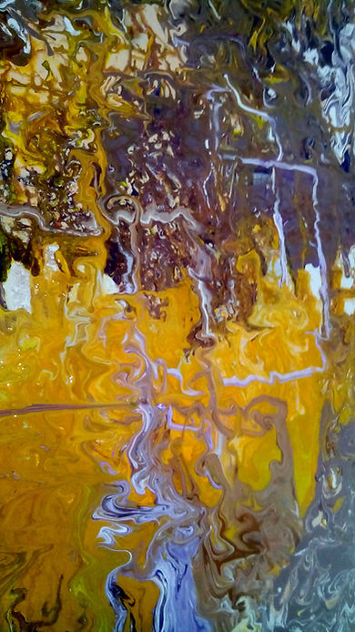 VOLUTES : Acrylic dripping op 3D doek 80 x 80 cm. Oker , geel en paars als hoofdkleuren.