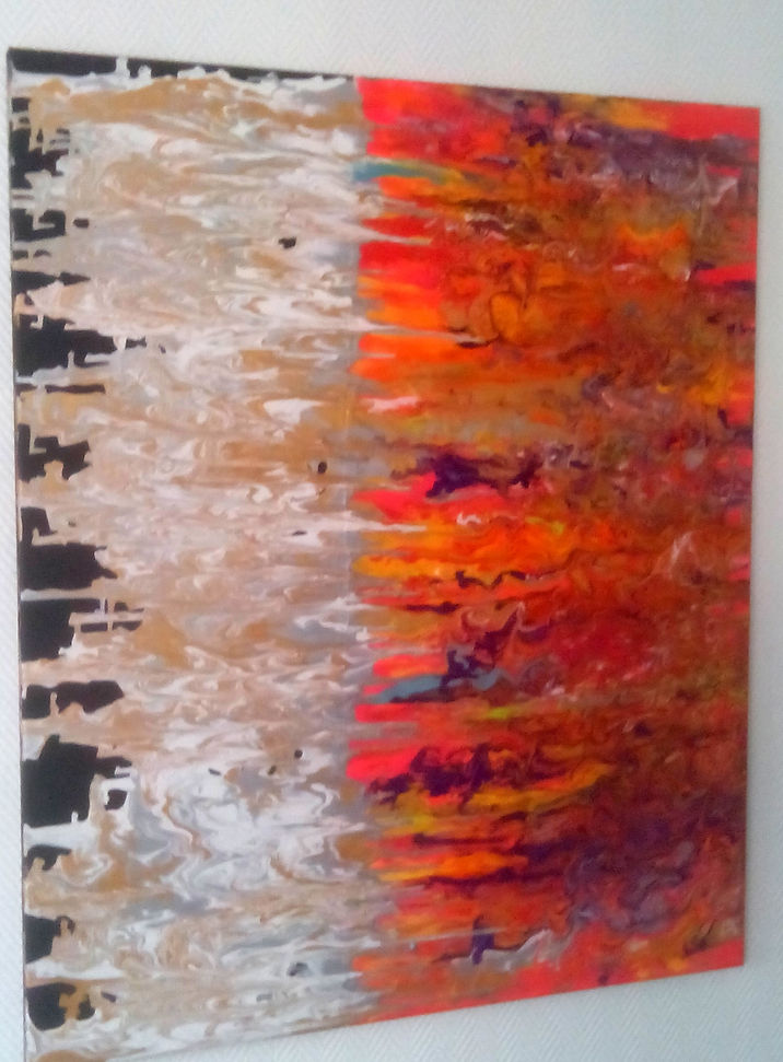 Le Pré : Acrylic 50 x 50cm 3D vernist , is een vloeisel van felle kleuren.